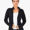 This comfortable ladies fit jacket features a moisture wicking fabric, front zipper with zipper garage, raglan sleeves with thumbholes, front seam pockets, and contrast color inserts on the back of collar, shoulder, and front.